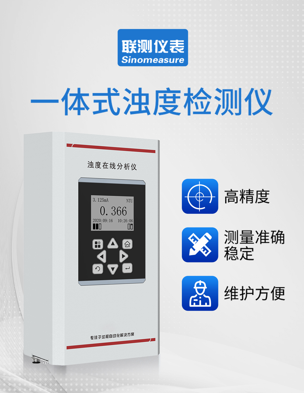 濁度在線分析儀是針對飲用水水質在線監測,量身研發的具有自主 知識產權的專利產品,具有超低濁度檢出限、高精度測量、設備長時間 免維護、省水工作和數字化輸出的特點,支持云平臺和手機移動端數據 遠程監控,以及 RS485-modbus 通訊,可廣泛應用于自來水出廠水、二次 供水、管網末梢水、直飲水、膜過濾水、游泳池、地表水等濁度在線監測。